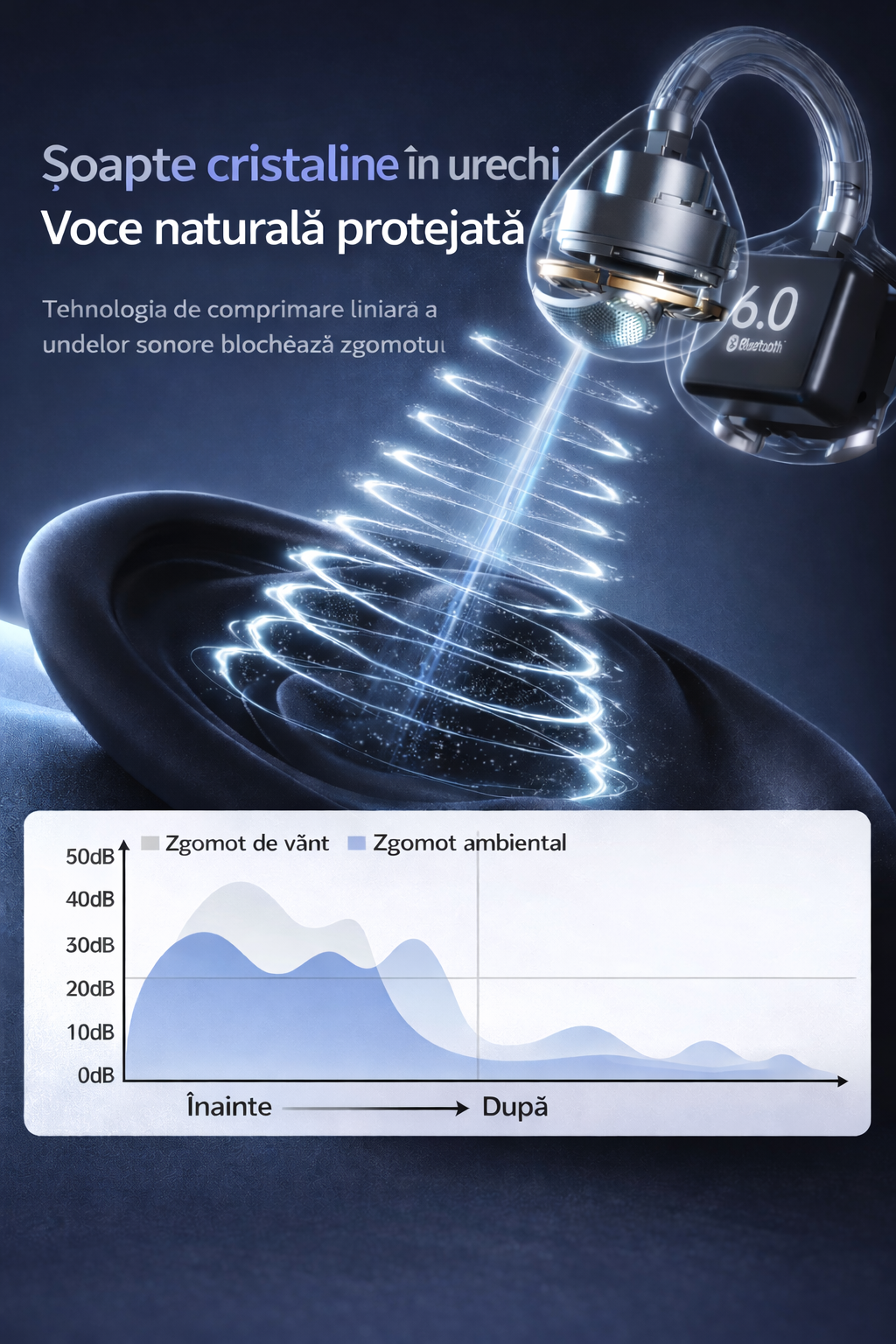 Casti Open-Ear Premium, VeReTech, Clip-On din Silicon, True Wireless, Bluetooth 6.0, High Definition Sound, Music Mode si Game Mode, Control Tactil Intuitiv, Carcasa de Incarcare 300mah, pana la 42 Or