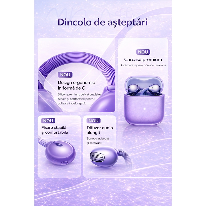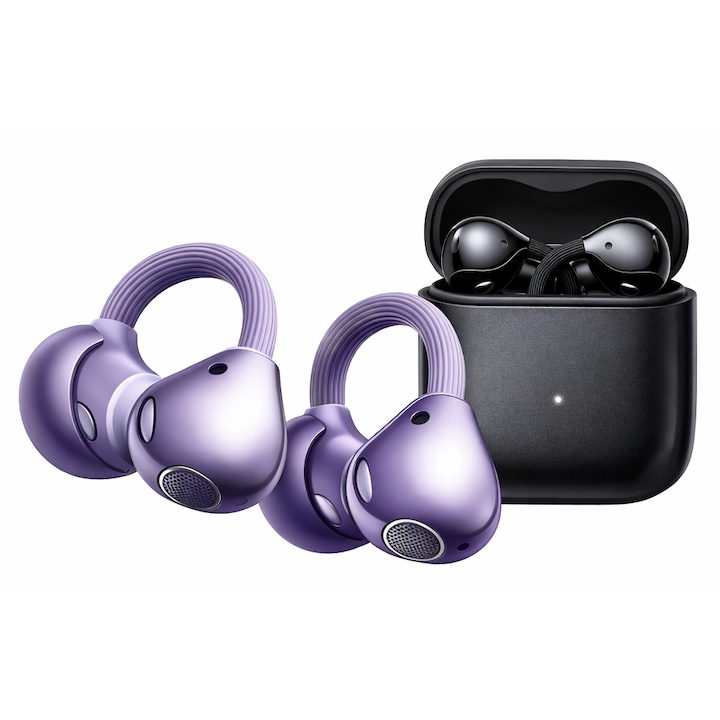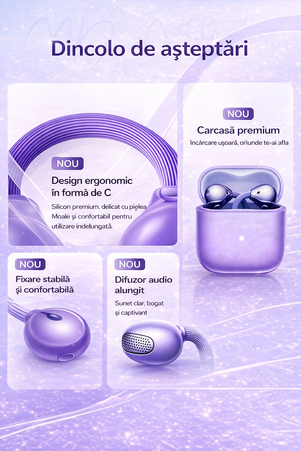 Căștile open-ear nu intră în canalul auditiv, ci se fixează pe ureche, oferind confort sporit și posibilitatea de a auzi și mediul înconjurător.