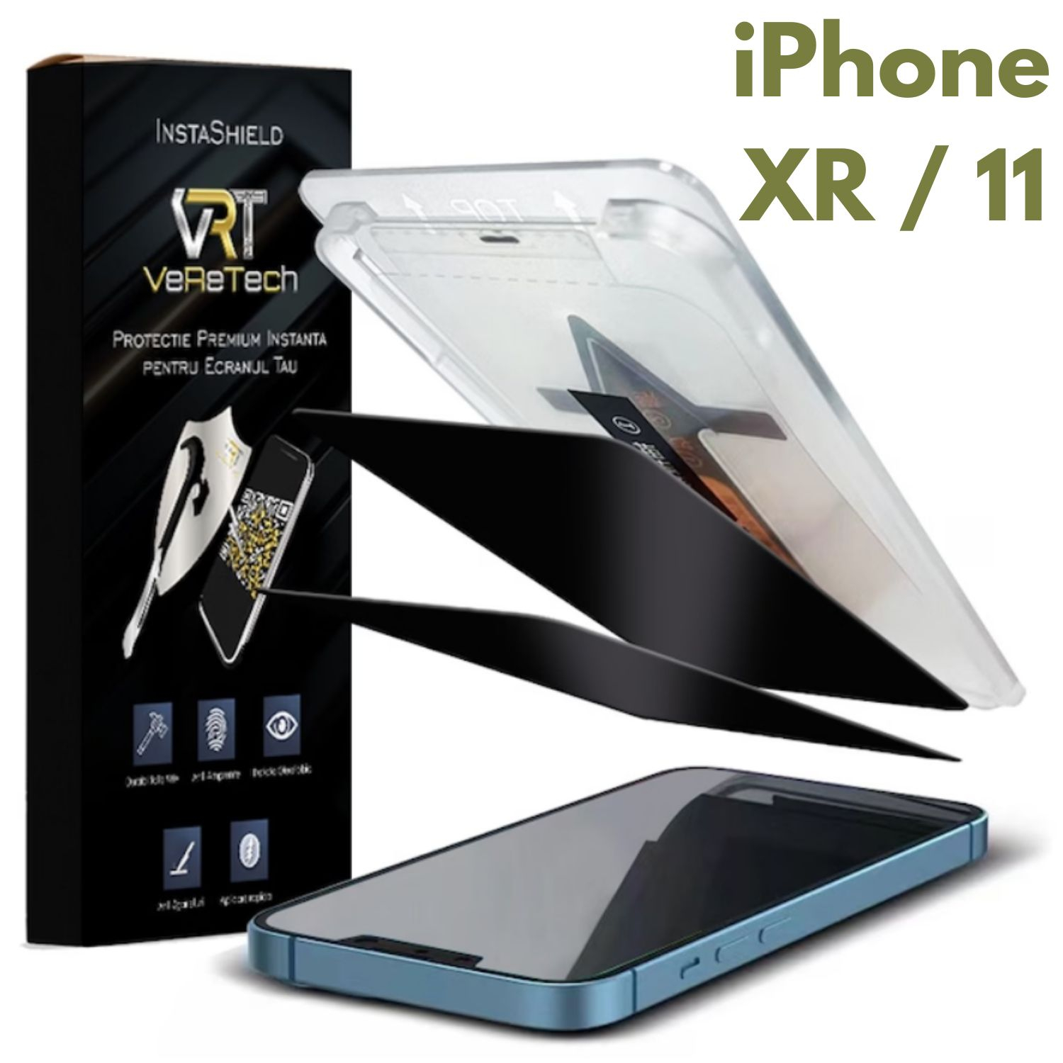 Folie de Protectie Privacy InstaShield by VeReTech pentru iPhone XR/11, cu Kit de Aplicare Instanta si Functie Automata de Indepartare a Prafului, din Sticla Securizata 9H+, Ultra Claritate Super HD,