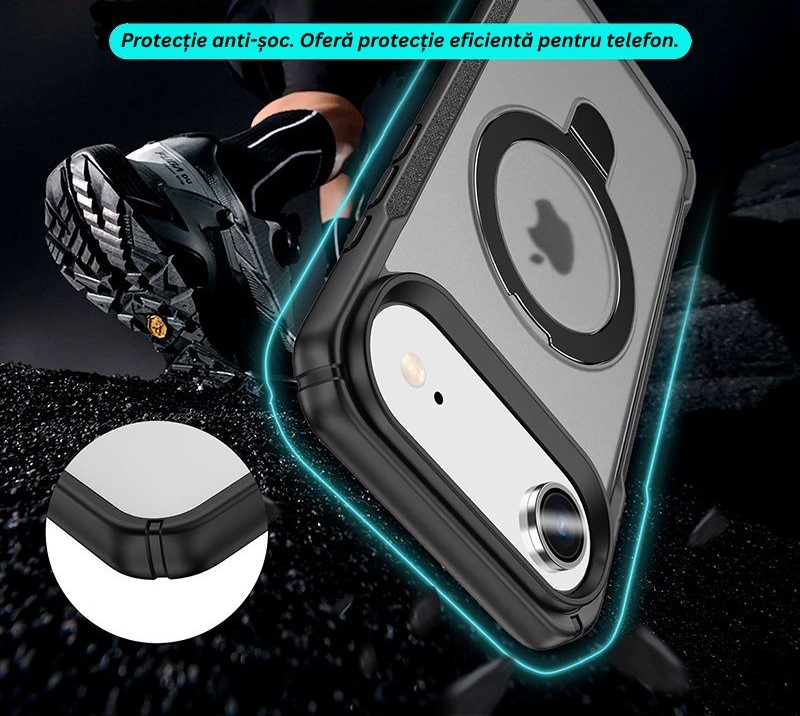 Inelul magnetic ajustabil, rotativ 360°, adauga functionalitate suplimentara: suport pentru filme, apeluri video si jocuri. Compatibilitatea totala cu MagSafe asigura prinderea ferma a accesoriilor si incarcarea wireless rapida fara a scoate husa.