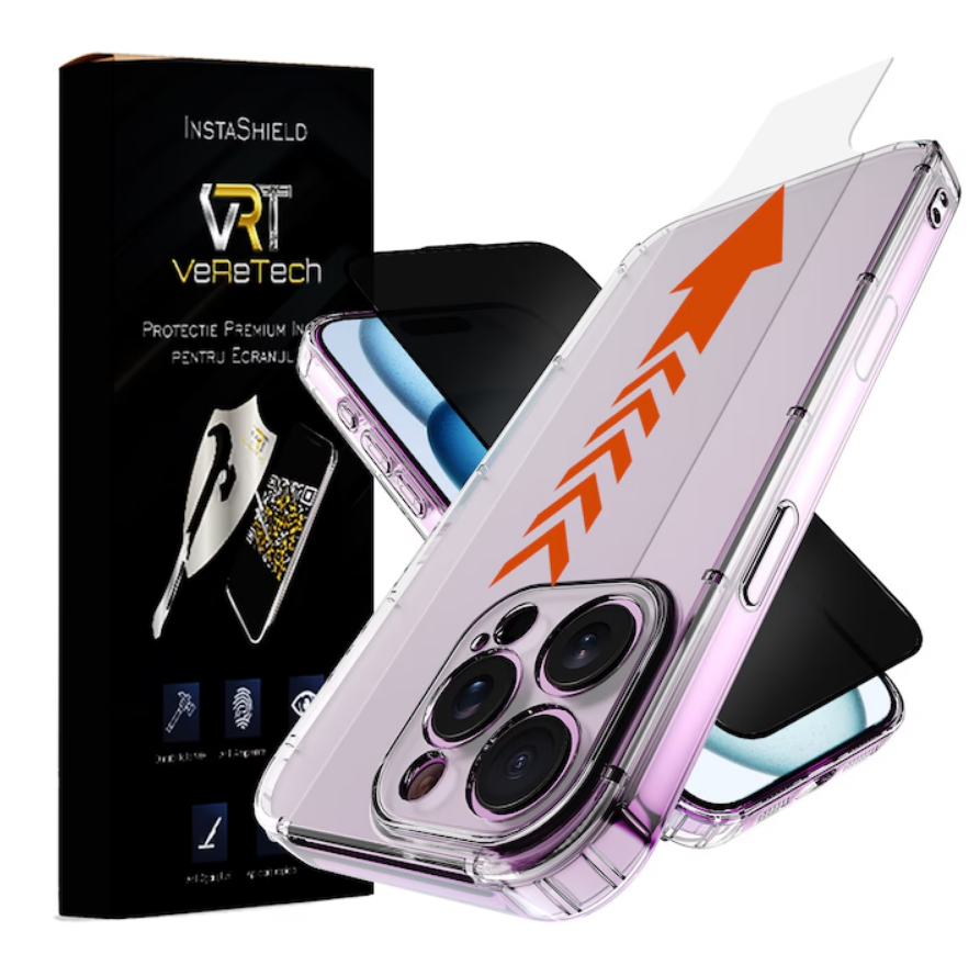 Kit de Husa din Silicon si Folie de Protectie Privacy, InstaShield by VeReTech pentru iPhone 15 Pro, cu Kit de Aplicare Instanta Care Se Transforma in Husa si Functie Automata de Indepartare a Prafulu